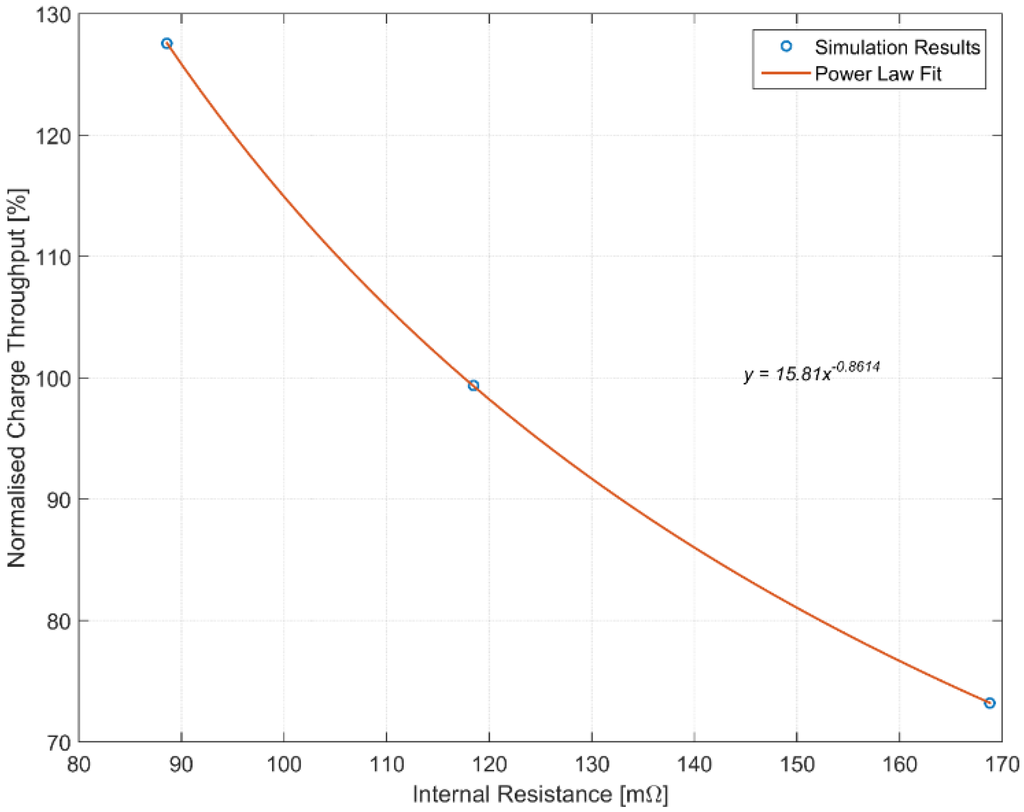 In Figure 9, the nominal charge throughput is plotted as a function of ohmic resistance. A power-law trend line has also been calculated using a least squares approach. A power law was chosen because, unlike a polynomial or exponential fit, it behaves logically when extrapolating: as resistance tends to infinity, the charge throughput tends to zero, and as resistance tends to zero, charge throughput tends to infinity.