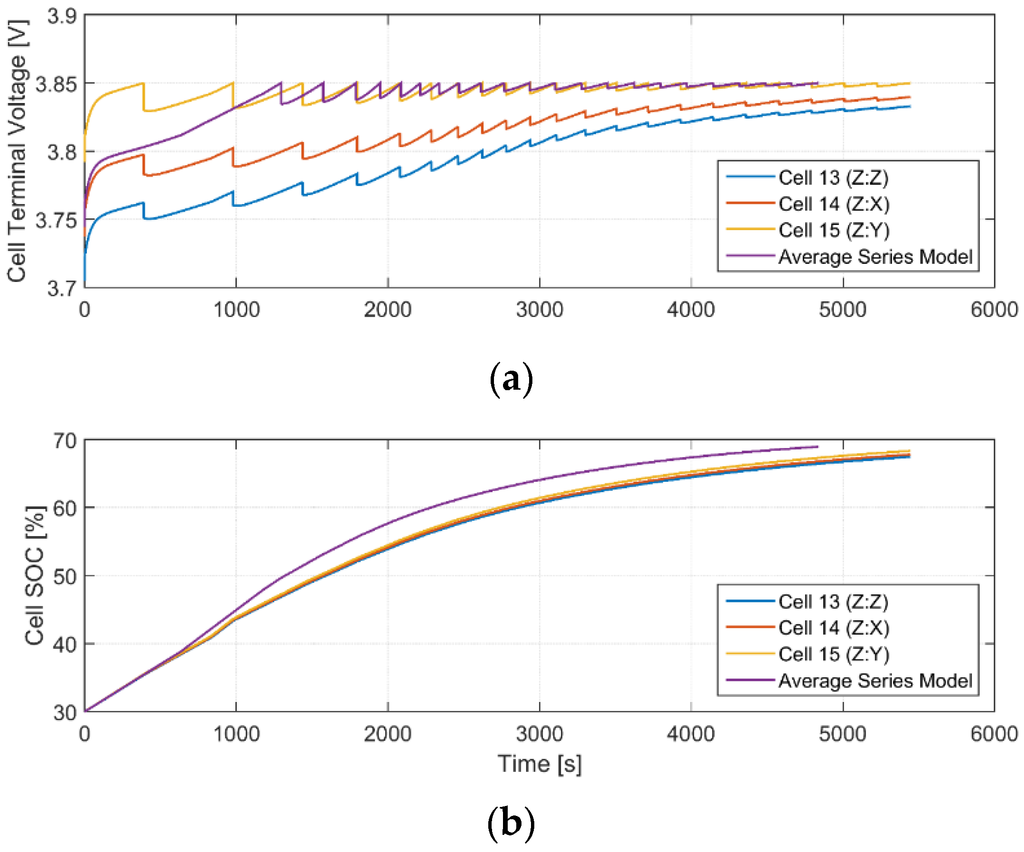 When cells are connected in series, the cell current is the same for each cell, but each cell can be at a different voltage. Differences in voltage can occur due to cells being at unequal SOCs and impedance variation between cells. Variations can occur for a variety of reasons, including differences in capacity, self-discharge rate and temperature [43,44].