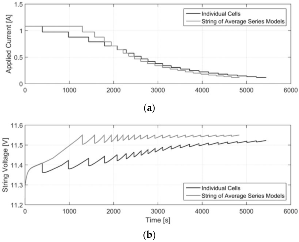(a) Charging current for a string of individual cells, and a string of mean series model cells; (b) Total voltage for a string of individual cells, and a string of mean series model cells.