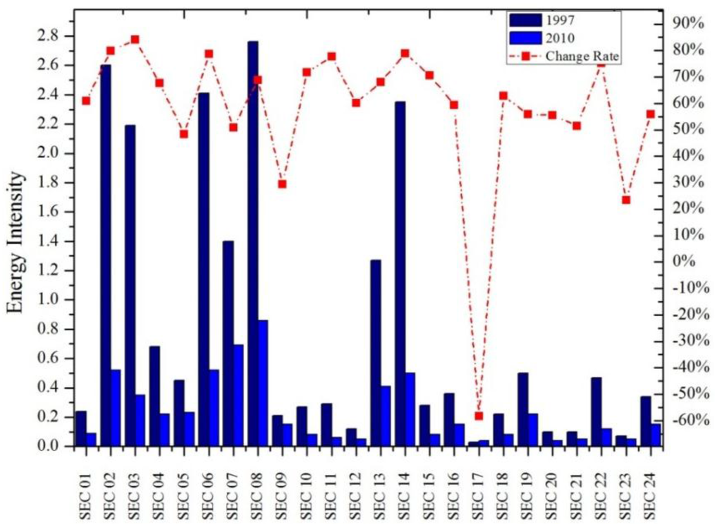 Figure 2 displays the energy intensities of 24 sectors in 1997 and 2010 with the red line representing change rates. The average drop of energy intensity is nearly 57% in all sectors. Thus, the effect of energy intensity, especially the decline of energy intensity in energy-intensive sectors, is the only one of many utilities that can significantly constrain the CO2 emissions. It is not peculiar to obtain this result. The emissions of CO2 mainly derive from the use of fossil energies. In a nutshell, energy utilization is the essence of CO2 emissions. The heavy industry denotes those industries that provide material bases for all department of national economy. The tag of “energy-intensive” is branded deeply, and sometimes this is indeed the case. In other words, heavy industries have lower energy efficiency and use a large amount of energy in early years. That is why the energy intensity effect can lead to a significant emission-reducing effect. Our results can be perfectly verified by the results of decomposition factors in sub-industries in Table 6. The energy intensity effect in heavy industry far surpassed other sectors and contributed to nearly 80% emission reduction of total energy intensity effect. Then, due to the characteristic of non-energy-intensive, the light industry, tertiary industry, agriculture and construction only contributed to 20% of emission reduction. Furthermore, the total effects of CO2 are further decomposed into three kinds of fossil fuels. It is shown in Figure 2 that 85% emission-reducing effect in energy intensity effect can be owed to the effect of coal.