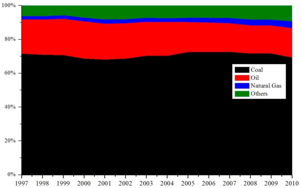 In the early days, the proportion of coal experienced an increase from 70.7% in 1978 to highest peak of 76.2% in 1986. Soon afterwards, with the eased domestic energy market of supply and demand situation of tension, the share of the coal in primary energy consumption has dropped continually. The lowest proportion 68.5% occurred in 2002. Recent years, the booming energy consumption caused by the rapid economic development resulted in the rise of the coal proportion again. Meanwhile, oil, serving as the second-largest fossil fuel, also plays a pivotal role. From the late 1990s to the beginning of the 21st century, the expansion of China’s foreign trade in oil has caused an increase from 16.6% in 1990 to highest peak of 24% in 2002. Along with the great upheavals of the international situation from 21st century, the oil supply fell short of demand dramatically. In this period, the proportion of domestic oil consumption has declined from 24% to 19% in 2010. Of the various fossil energy sources, natural gas is the only clean energy in fossil fuels. The consumption of natural gas has showed an appreciable increase in recent years. According to “National Plan on Climate Change (2014–2020)”, China’s natural gas consumption in the proportion of primary energy consumption will account for more than 10%. Other energy such as nuclear, hydraulic, wind, and solar power, has been a center of focus. It experienced vigorous growth and doubled over 1990–2010. The rapid development of clean energy has contributed substantially to CO2 reductions. Figure 3 depicts the variation of China’s energy consumption structure in 1997–2010.