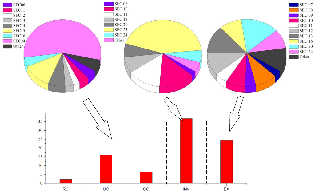 Investment serves as the “troika” of the economic growth, has always made a significant contribution on CO2 growth. The pie chart in the middle in Figure 4 shows that seven sectors contribute significantly to CO2 emissions growth in the process of capital formation. Among them, 43.8% of increment causes by capital formation of construction. Historically, the added value of construction reached 1898 billion Yuan in 2010, more than septupled since 1997. Along with urbanized and modernized advancement quickening, more and more municipal construction and other facilities have been launched by the government. In recent years, the growth of FAI (total fixed asset investment) maintained a high level. Following the construction, the manufacturing industry, including manufacture of special and general purpose machinery, transport equipment, electrical equipment, and electronic equipment, occupied second place. Although manufacturing is developing rapidly with significant investment needs, it is nowhere near the construction industry. Three heavy industries, SEC 10, SEC 11, and SEC 12, and one light industry, SEC 20, contributed 15%, 14%, 7.8% and 6.5% increment of CO2 emissions, respectively. In recent years, the manufacturing growth is significantly faster than the overall growth of the national economy, which largely promoted the CO2 emissions. Furthermore, the results in Table 6 perfectly demonstrated that the investment expansion effects are mainly concentrated in heavy industry and construction. Other sectors, containing the agriculture, most of light industries and extractive industry, metal and nonmetal ores and so on, merely contributed 4.76% increment of CO2 emissions in the process of capital formation.