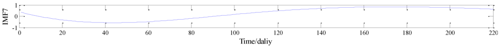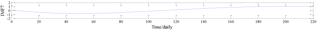 To improve the forecasting performance of wind power generation series, in this study, EEMD is devised for decomposing the raw series. To corroborate the performance of EEMD, EMD is employed to decompose the original series. EMD is similar to EEMD, and the two technologies both decompose the raw wind power generation series into seven IMFs and one residue. However, for the same IMF7 from Figure 2 and Figure 3, it can be seen that EEMD can retain the true information of the original data sequence to the utmost, and effectively suppress the occurrence of mode mixing and eliminate the noise, in line with the actual situation.