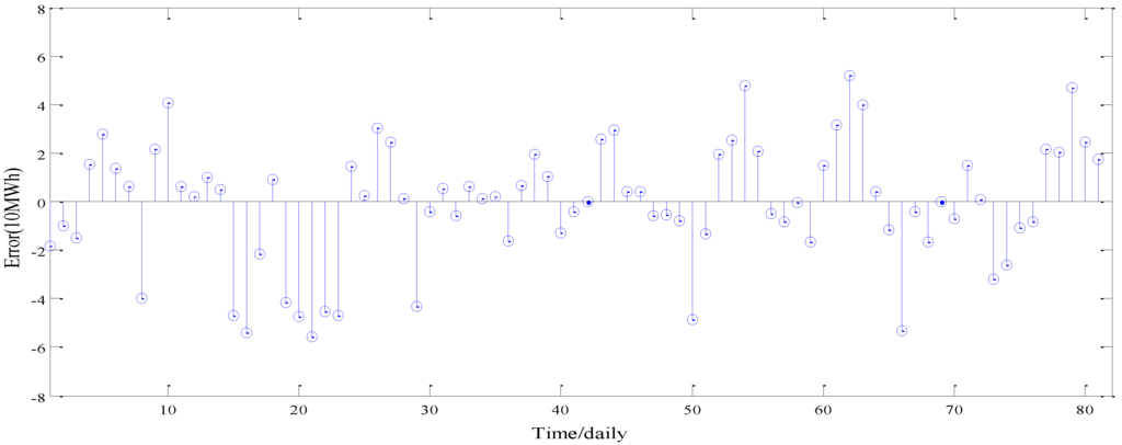 Then, the forecasting performance of the LSSVM model with the parameters tuned by the BA is examined by using the testing set. The prediction errors of LSSVM are presented in Figure 4. From Figure 4, it can be seen that the error change of LSSVM is relatively steady, and only four errors exceed 5. Furthermore, the maximum error is −5.5741 amongst all errors. Thus, it implies that the forecasting results can be considered acceptable.