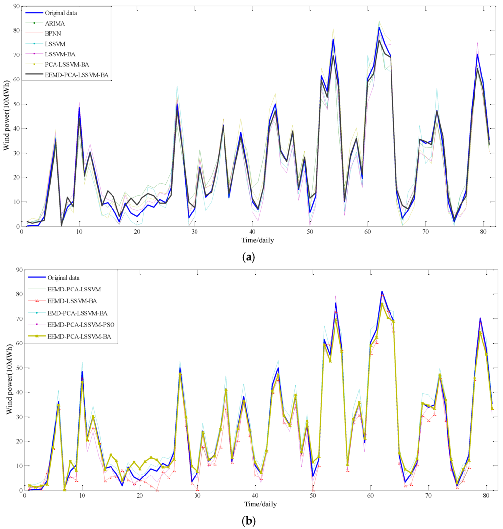 The forecasting results with different models. (a) autoregressive integrated moving average (ARIMA), BPNN, LSSVM, least squares support machine-bat algorithm (LSSVM-BA), PCA-LSSVM-BA and EEMD-PCA-LSSVM-BA models; (b) EEMD-PCA-LSSSVM, ensemble empirical mode decomposition-least squares support machine-bat algorithm (EEMD-LSSVM-BA), EMD-PCA-LSSVM-BA, EEMD-PCA-LSSVM-PSO and EEMD-PCA-LSSVM-BA models.