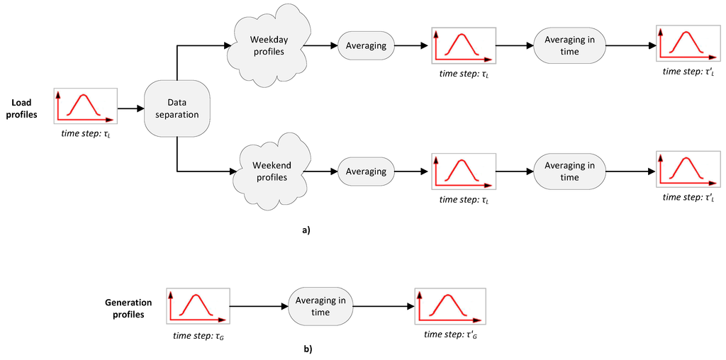First, the available data are separated into two distinct groups related to the customer demand during weekends/holidays and weekdays. Next, the consumption profile of the customer at a given month is evaluated by averaging the load data as separated in the previous stage. In total, twenty-four annual load curve patterns are constructed, two for each month of a year. Moreover, the gathered input data may be at different time step (τL) than the one used for the load profiles. The required load curves are adapted to the model’s time step by averaging in time the data based on the model’s time interval (τ’L).