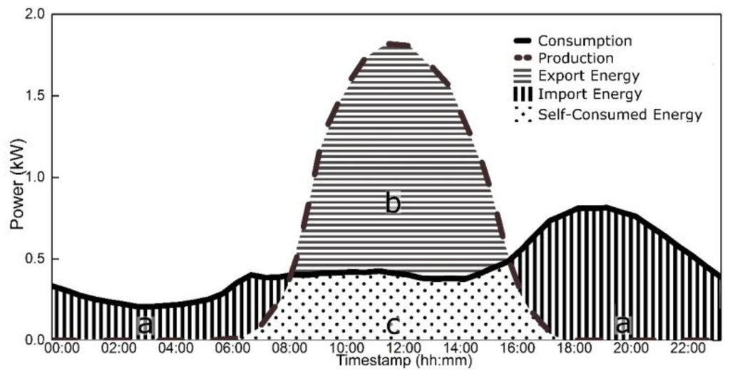 A NEM policy may use various elements related to the consumption and production of electrical energy within a time step. In order though to utilize some of the following elements in a real installation, a configuration using two meters is required. In case a new perspective installation is evaluated, the estimation of the self-consumption and the utilization rates may be necessary. These are defined with the aid of Figure 3 as follows: