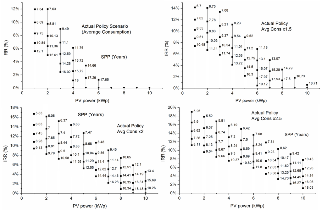 Utilizing the methodology of Section 3, a series of simulations were performed for each of the 4 consumption cases. The PV installed capacity varies between 1 kWp and 10 kWp while the installation costs vary between 1200 €/kWp and 2000 €/kWp with a step of 200 €/kWp. Figure 7 depicts both the calculated IRR and the SPP for each PV-installed power and each installation cost, for the 4 consumption cases. The black rectangles, which are shown on the vertical lines at each installed power value, correspond to a different installation cost, the top being the lowest one (1200 €/kWp).