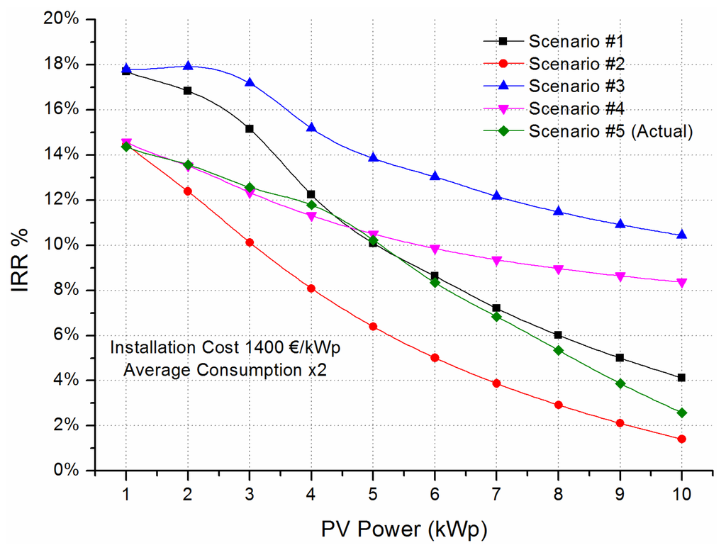 The base case examined here takes as input the average load curves of Figure 6 increased by 100%. The justification for this choice is that it is more likely for a high-consumption prosumer to install a NEM PV system than for a low-consumption one. Initially, the installation cost is set to 1400 €/kWp and the four alternative scenarios are compared with the current NEM policy (Scenario #5) under varied PV-installed power. Figure 8 depicts the variation of the IRR indicator for each of the 5 scenarios considered.