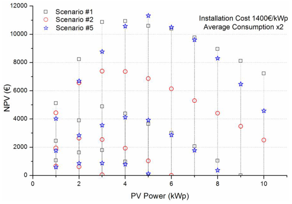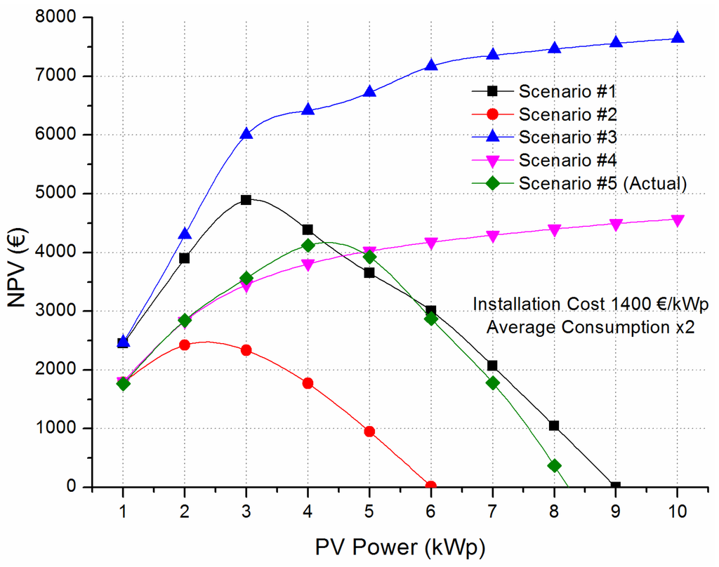 Comparing the results from the NPV variation in Figure 9 with the ones from the IRR variation, it may be realized that the optimal PV-installed power ranges between 2 kWp (Scenario #2) and 4 kWp (Scenario #5—current NEM policy). Also, the compensation of the excess energy with the current FiT that is foreseen in Scenarios #3 and #4, leads to an optimal PV power higher than 10 kWp.