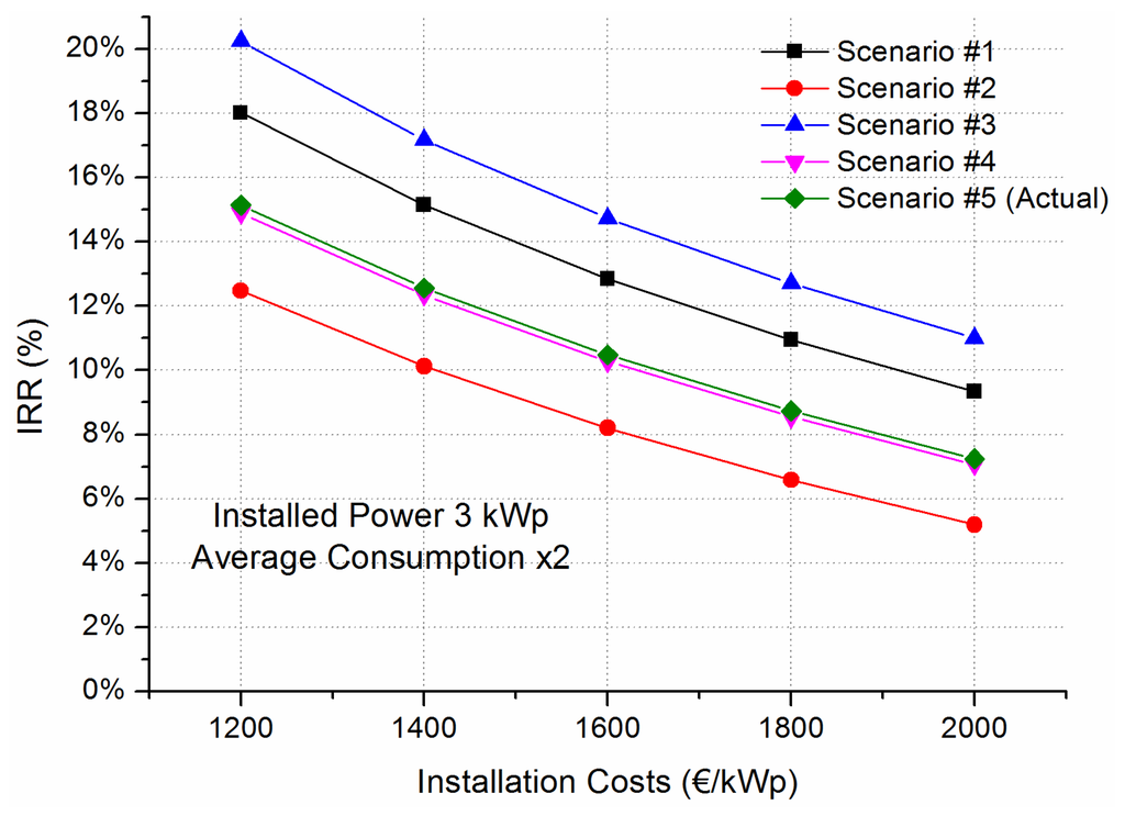 Finally, Figure 13 shows the influence of the consumption profiles of the prosumer on the IRR indicator, with PV installed capacity of 2 kWp and installation costs at 1400 €/kWp, for each of 5 examined scenarios. As shown in Table 8, the increased consumption leads to higher netted costs resulting from the higher electricity pricing according to the residential tariff “G1”. Here the conclusions are as expected, i.e., for all investigated scenarios higher consumption leads to increased investment rate of return. Such graphs may be used by policy makers if the aim is to target a certain prosumer consumption profile when designing a NEM policy.
