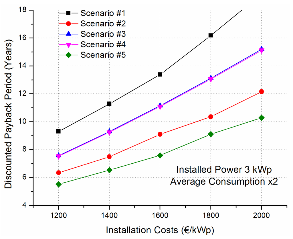 Next, the influence of the installation cost parameter is examined. Figure 11 shows the variation of the IRR indicator for all scenarios, under varied installation costs with 200 €/kWp step. Furthermore, Figure 12 depicts the variation of the DPP indicator using a DR of 5%. In both graphs, the installed PV power is 2 kWp and the consumption is taken as double the average profile of Figure 6.