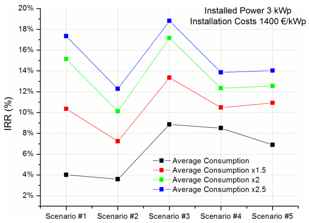 Variation of IRR for different average consumption profiles, 3 kWp PV installed capacity, 1400 €/kWp installation costs, for each of 5 examined scenarios.