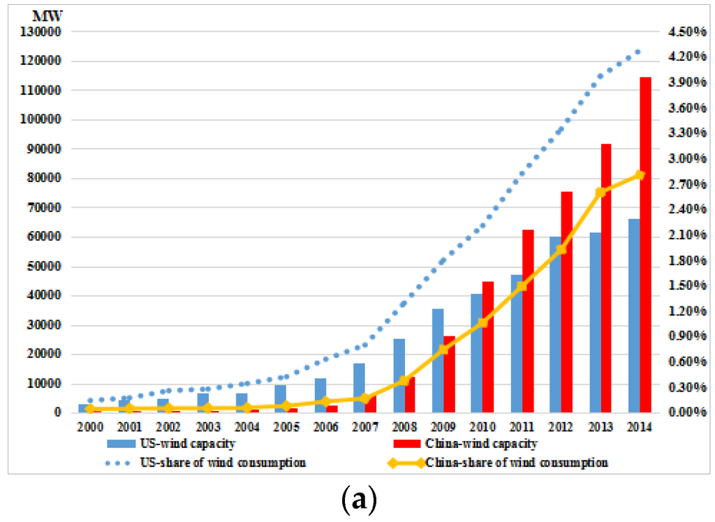 However the power industry contributes the largest pollutant emissions in both countries and also attracts the most attention regarding global climate change, therefore the renewable energy sector has also developed rapidly in both countries. The growth of wind power in both countries is the fastest among all generation technologies. In 2013 China’s wind power capacity was 1.5 times of that in the US (Figure 6a [29]). However, the actual consumption share of wind power in China, restricted by an inefficient power dispatch mode and grid integration hurdles, was only 78% of that in the U.S. [29]. At the same time, the development of solar power in China was accelerated from 2011, but the consumption share was almost the same as the US (Figure 6b [29]). Figure 7 [29] compares the consumption share of renewable energy between China and the US in 2014. The share of renewable energy consumption in China was still 10% lower than that of the US. Therefore optimizing the power generation mix, increasing the consumption of renewable energy, reducing fossil fuel consumption is a feasible method for ECER in China.