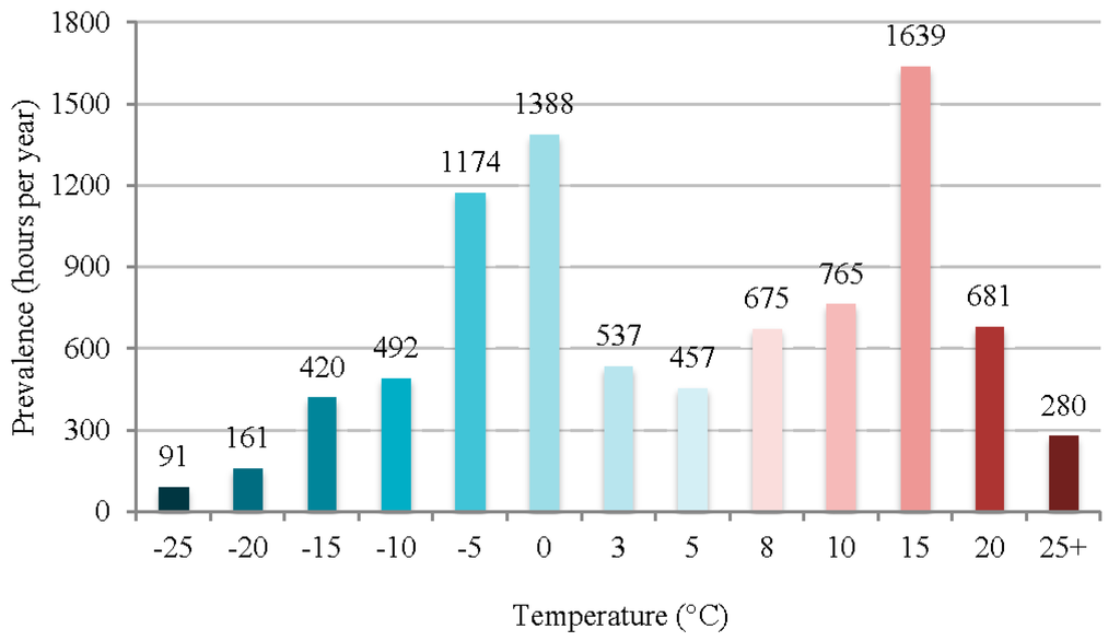 Figure 4. Outdoor air temperature annual distribution histogram. - All thermal designs have identical annual heat supply rates;