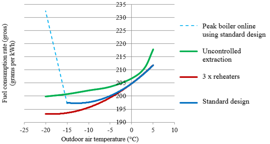 At lower outdoor air temperatures, the relationships become manifestly non-linear. It is evident that increased heating load makes the uncontrolled extraction design suffer from a significant increase in the specific rate of fuel consumed on electricity generation compared to the standard design.