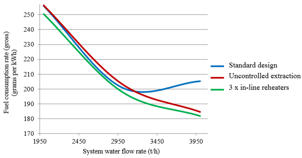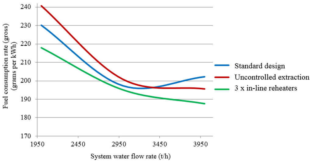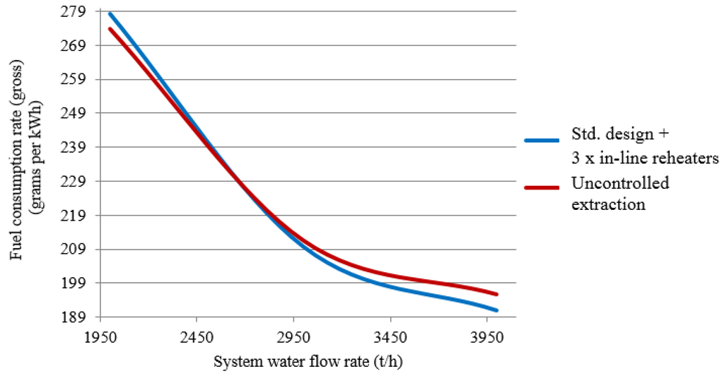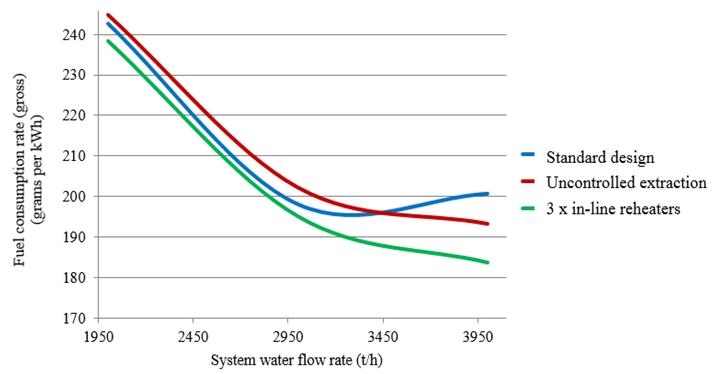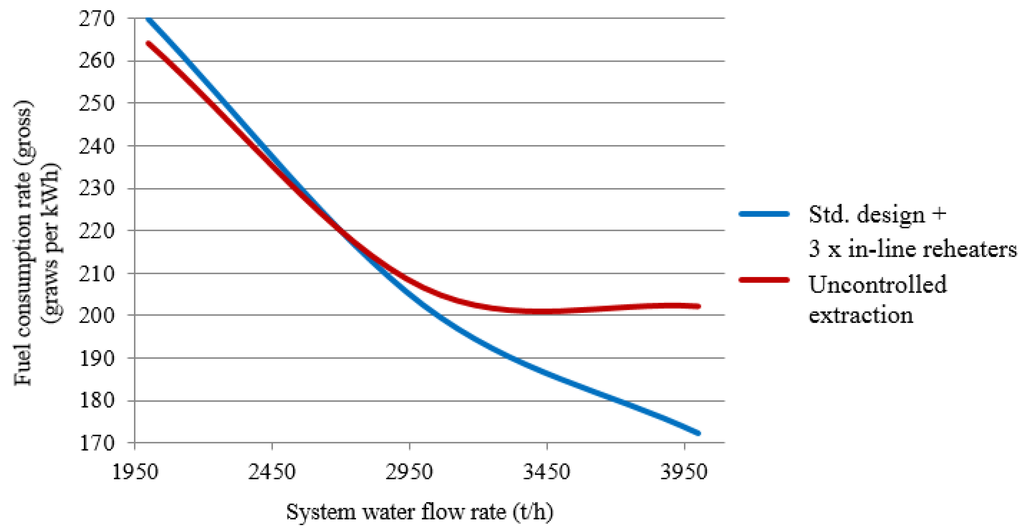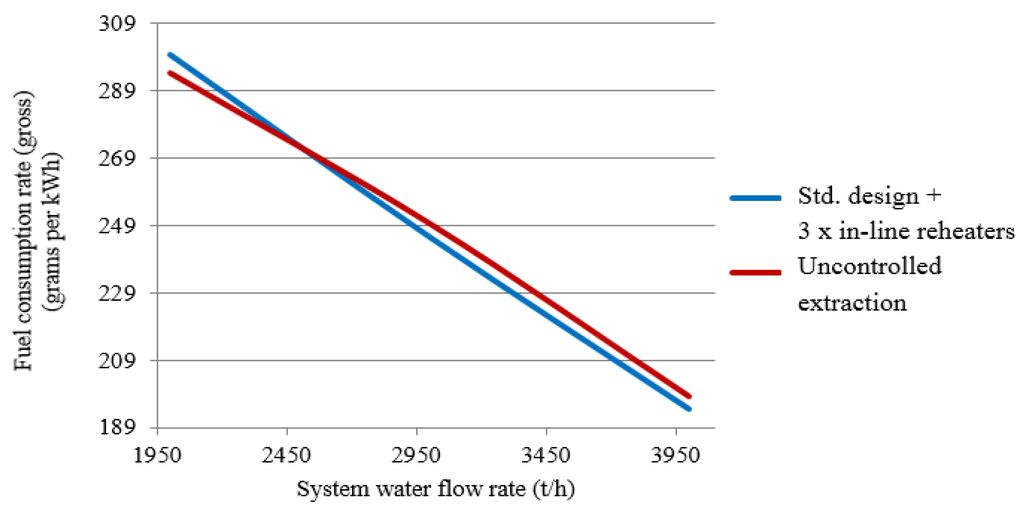 Figure 6 plots fuel-equivalent consumption rates for electricity generation as functions of the system water flow rate for the standard design and designs featuring three inline reheaters with controlled and uncontrolled cogeneration extraction locations assuming a fixed outdoor air temperature of +5 °C. As the heating load is maintained at this temperature across a range of water flow rates without having to bring an extra inline reheated online, the respective plots for the three-reheated design with controlled extraction will match those for the standard design.