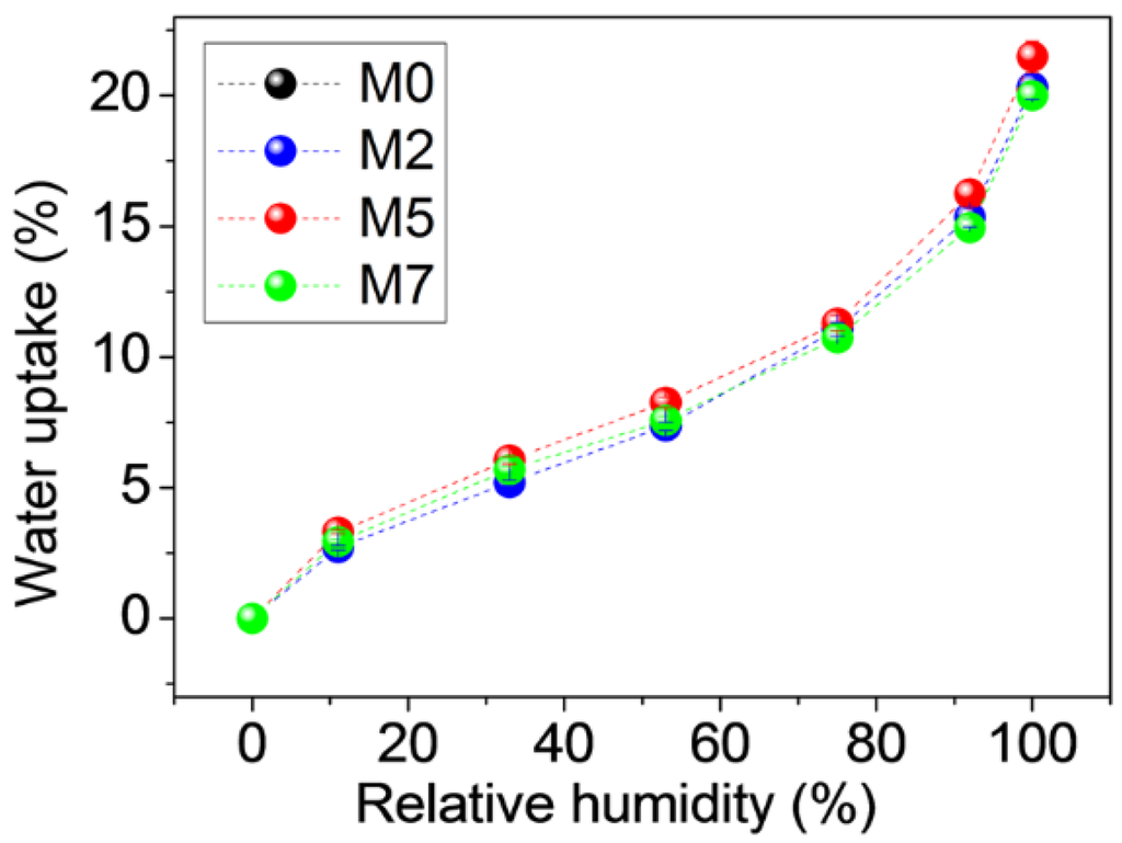As expected, all samples show a similar isothermal trend with RH, typical of multilayered water adsorptions. Minor differences can be noted depending on the filler content. M0 and M2 display indistinguishable behaviors, whereas M5 sample keeps the highest hydration even compared to M7 either at low and high RH values.