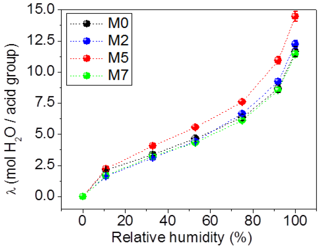 The ratio between WU and IEC allows to estimate an important functional parameter that is the number of water molecules adsorbed per unit of acid site (λ), reported in Figure 2 as a function of RH.