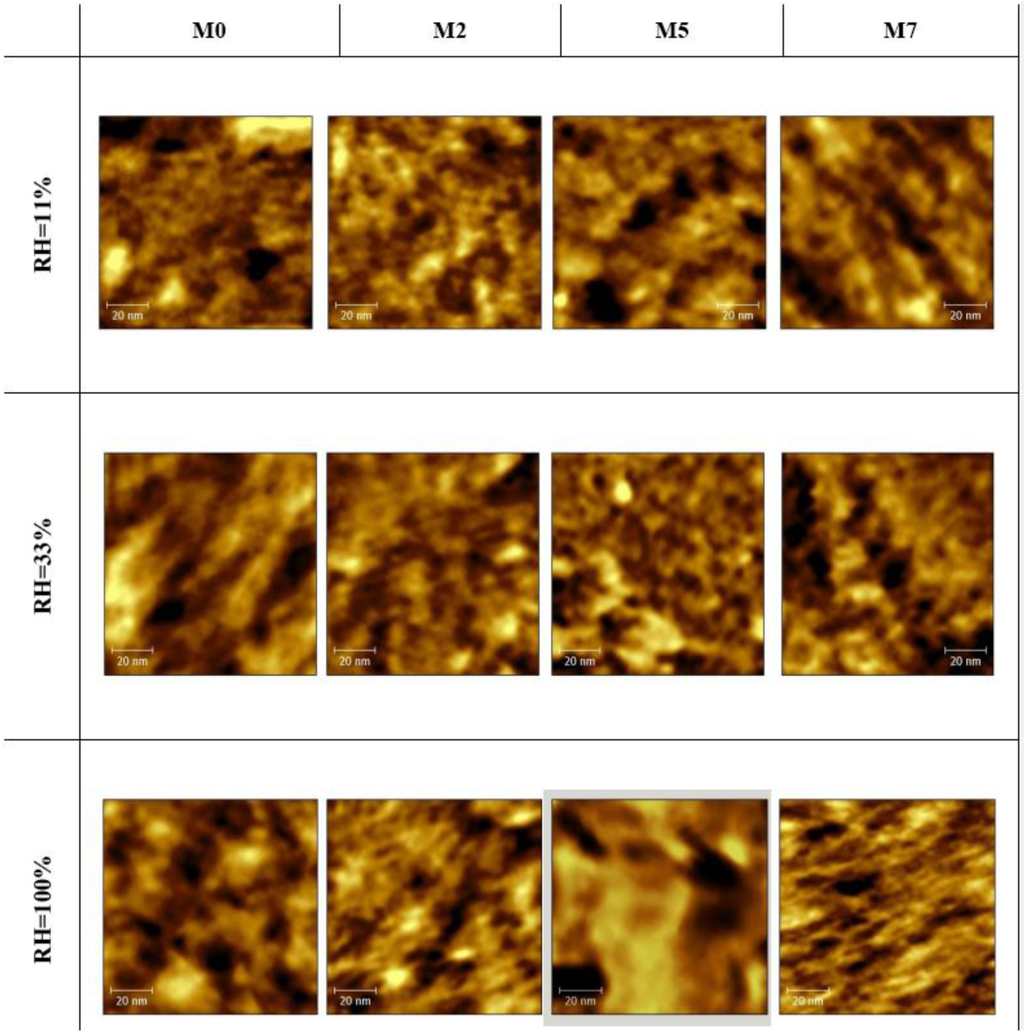 Atomic force microscopies (AFM) for the four membranes in three different RH conditions.