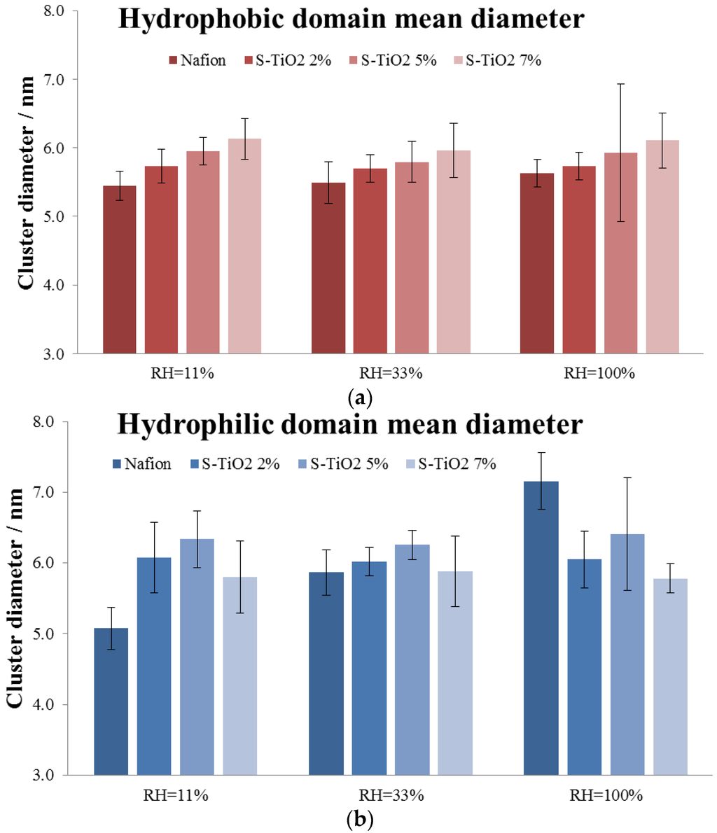 Focusing on the last general trend, apparently the modification of the hydrophilic domains at different RH is strongly altered by the incorporation of the oxide particles. Recast Nafion™ without additives shows a monotonic expansion of the hydrophilic clusters from 5.5 nm to 7.3 nm in size passing from 11% RH to 100% RH. On the other hand all composite membranes show only minor alterations. Surprisingly the size of the hydrophilic domains in all S-TiO2-added membranes is rather independent from the membrane hydration.