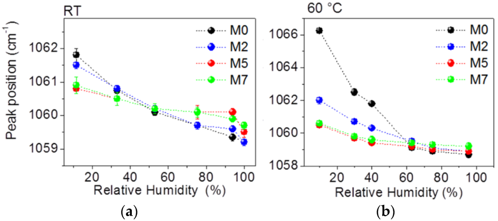 Peak position attributed to the SO3− vibration mode measured on the pure Nafion™ and on composite membranes in function of RH (a) at room temperature; and (b) at 60 °C.