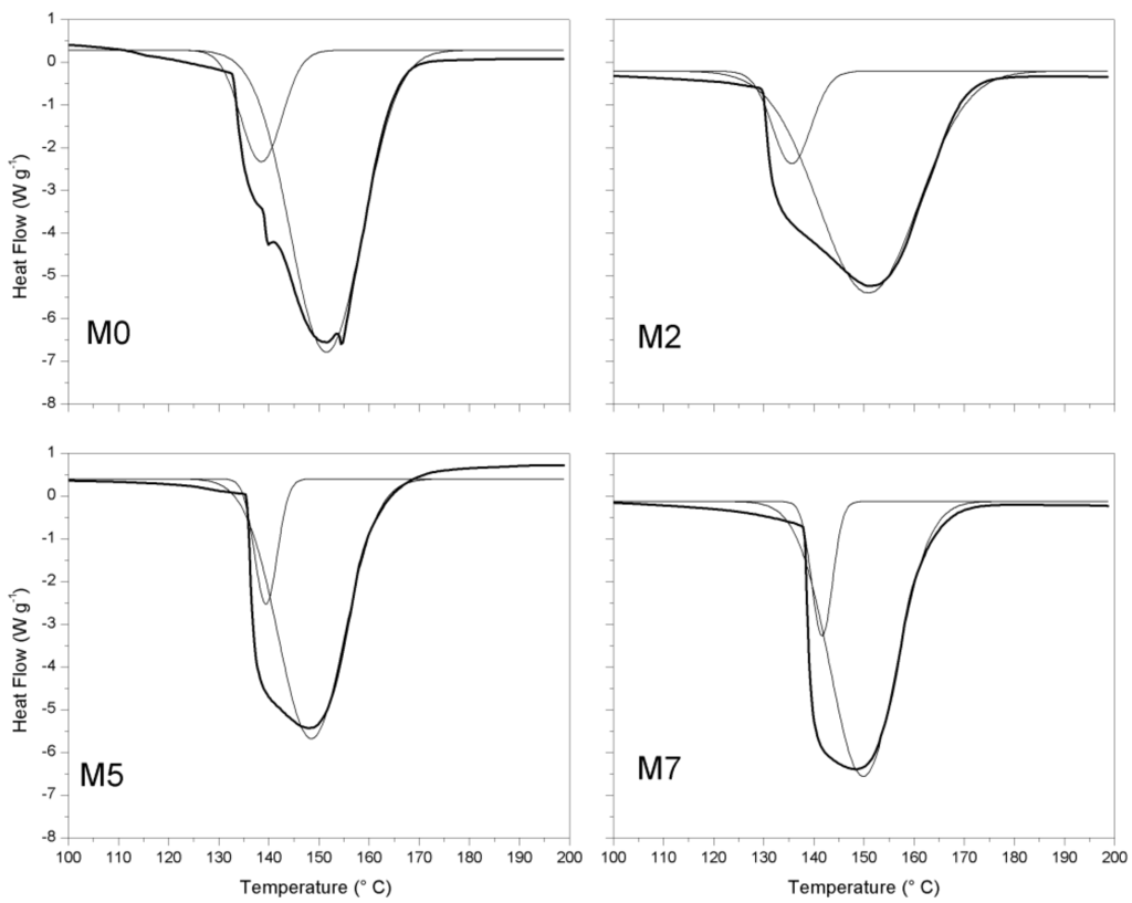 Differential scanning calorimetry (DSC) traces of the membranes samples (black line) and Lorenztian functions utilized to fit them (gray line).