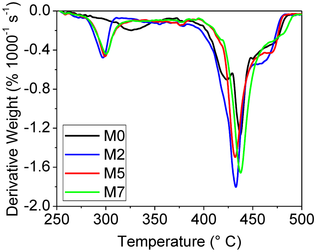 The derivative TGA curves measured for the four membranes are shown in Figure 7 in the 250–500 °C temperature range. The decomposition of the Nafion™ polymer matrix occurs in three main stages [16,43]. The first decomposition, associated with desulfonation of the side-chain of Nafion™, seems to be catalyzed by sulfated titania, as it occurs at lower temperatures for the ceramic-added membranes (i.e., 320 °C for M0 samples and below 300 °C for M2-5-7). The second and the third transitions, occurring in the range 400–450 °C, are related to side-chain and PTFE-backbone decompositions [47]. Sulfated titania looks to alter these transitions too. In fact the the two separated peaks observed for M0 are overlapped for the M2 sample, and totally convoluted in single sharp peaks for M5 and M7.