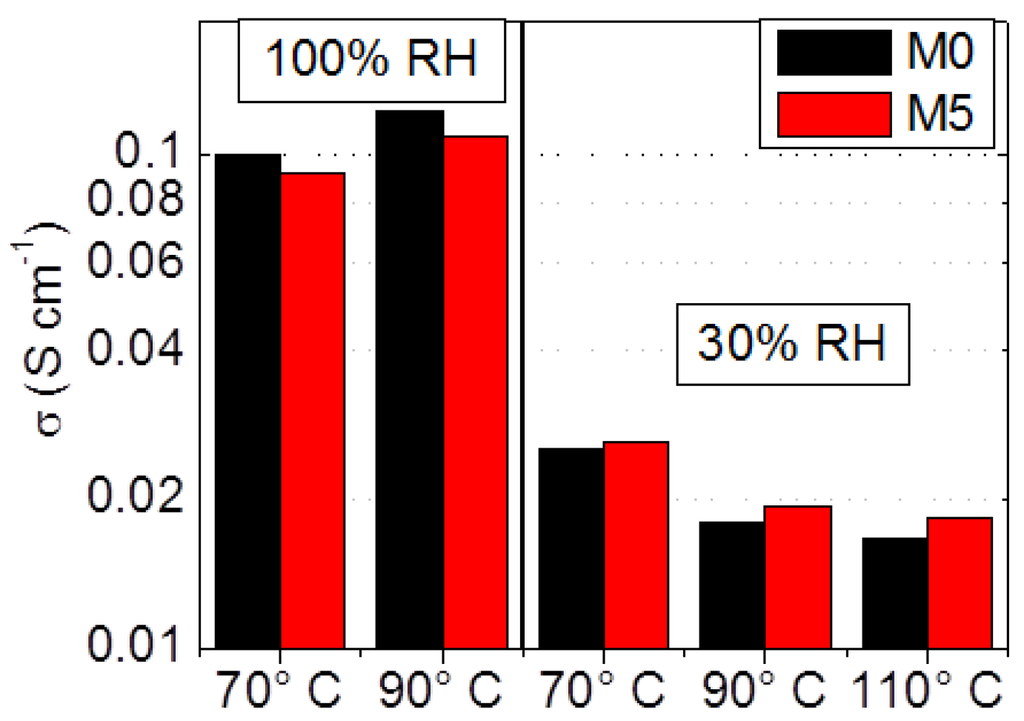 The investigation of the properties of the composite membranes discussed in the previous sections suggest the existence of a critical concentration of S-TiO2 filler. In fact whereas the M2 sample has properties close to those of recast Nafion, M5 and M7 samples show different thermal and water bonding properties. Between M5 and M7 membranes, the first one has the larger WU, larger amount of water molecule per acidic site and larger size of the hydrophilic domains whereas thermal and proton bonding properties derived from Raman spectroscopy are very similar. In this view we selected membrane M5 for further electrochemical investigation, in close comparison with bare recast Nafion™. Proton conductivities of M0 and M5 samples, derived from impedance spectra recorded under fuel cell operations (see Section 2.2) are shown in Figure 8.