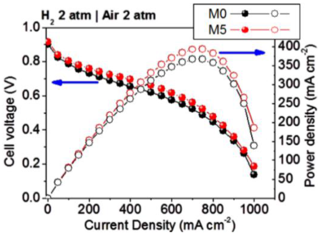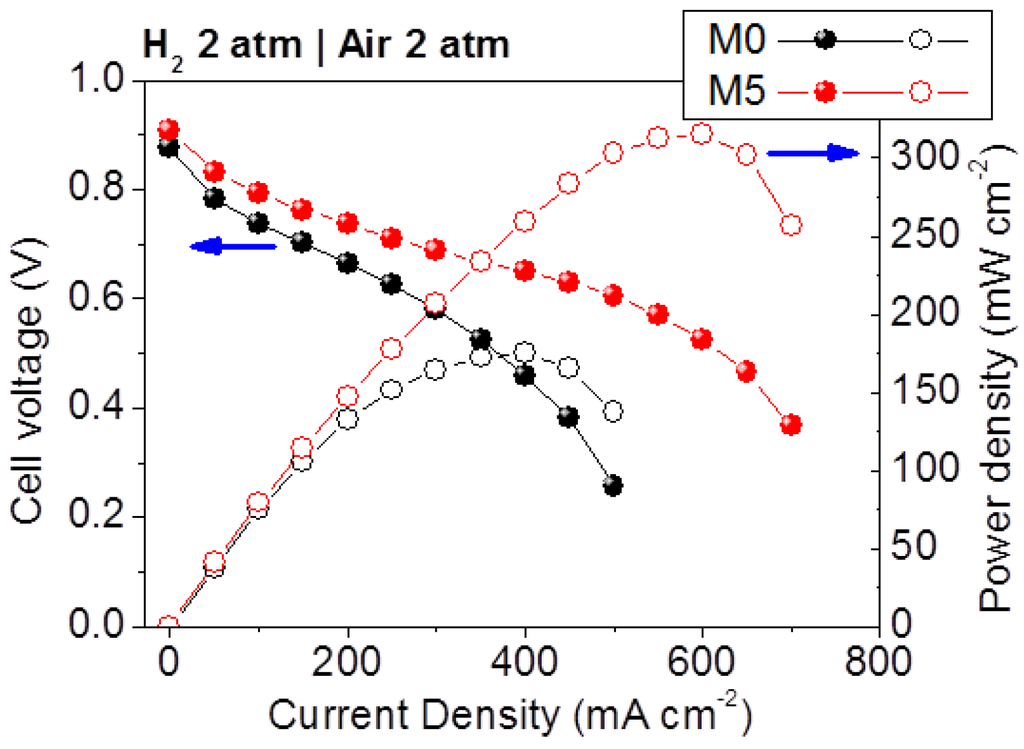 Fuel cell performances have been evaluated by assembling two cells using either M0 or M5. Performances at 70 °C and RH = 30% are shown in Figure 9 whereas performances in more challenging conditions at 110 °C and low RH are presented in Figure 10.