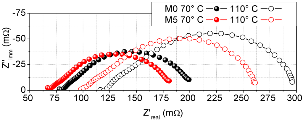 Impedance spectra measured at 6.5 V for both fuel cells under 70 °C and 110 °C and 30% RH are shown in Figure 11. The higher frequency intercepts on the real axis can be considered as the total non-electrode ohmic resistance of the cell, meanwhile the lower frequency intercepts is due to the overall charge transfer interfacial resistances. The composite M5 membrane shows smaller ohmic resistance both at 70 °C and 110 °C as well as smaller charge transfer resistance compared to M0. These enhanced electrode/electrolyte interfacial properties, as well as the lower ohmic resistance associated with M5, explain its better behavior showed above in terms of cell performance. Since the thickness of the two membranes is comparable (see data shown in Table 1) and electrode active area is the same, the reduction of the ohmic resistance can be easily attributed to the larger conductivity value observed for the M5 membrane compared to Nafion™ at low humidity (RH = 30%). Turning to the different charge transfer resistance, one may speculate about a possible improved interfacial properties between membrane and electrode in the presence of the S-TiO2 filler. In literature the beneficial effect of inorganic additives on the relaxation process of Nafion™ at high temperature and low humidity has been discussed [6]. Apparently fillers may reduce the shrinkage of membranes thus preserving the quality of the electrolyte/electrode interface in non-standard operating conditions. Also the increased hydration of the M5 membrane at low RH compared to recast Nafion™ may contribute to the reduction of the charge transfer resistance.