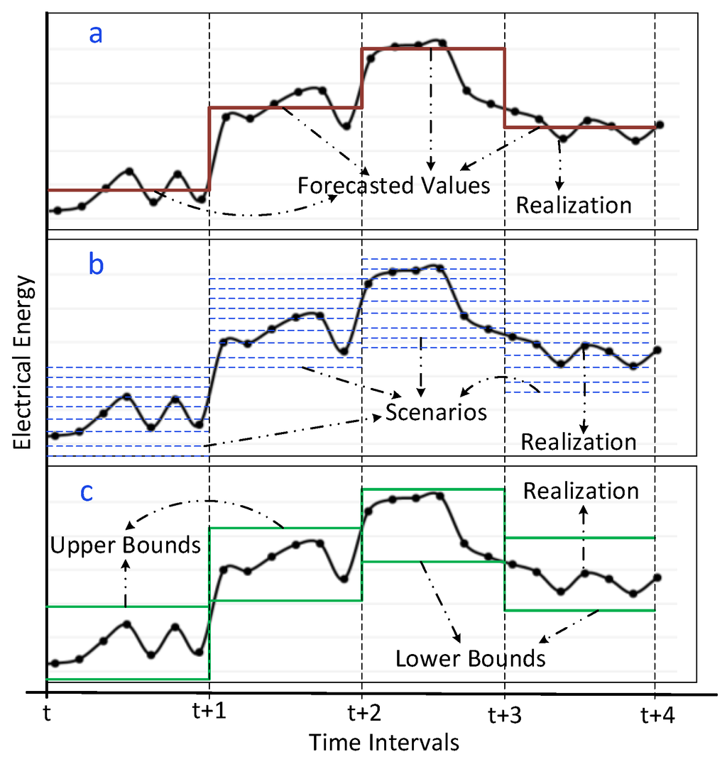 However, the selection of these fuzzy sets is specific to the experience of the decision makers and is somewhat free and subjective [17]. Stochastic optimization has been widely used for scheduling of uncertainty-aware microgrids. However, due to various limitations of stochastic optimization and numerous advantages of robust optimization, RO has gained tremendous popularity in optimization of microgrids. Figure 1b shows a stochastic optimization approach and Figure 1c shows the RO approach. It can be observed that RO only needs information about the upper and lower bounds of uncertainty. The major drawbacks associated with the stochastic optimization and merits of RO can be summarized as follows.