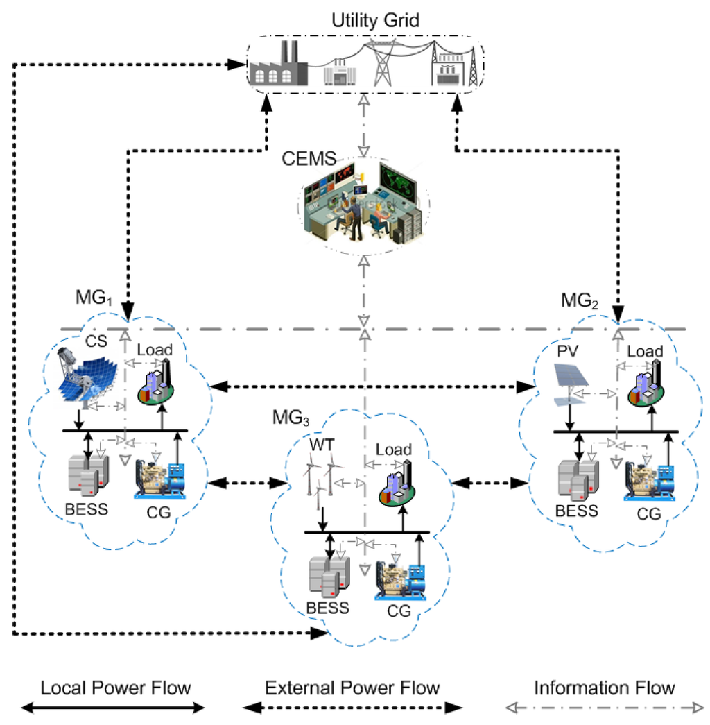 Each MG sends its information to the community EMS (CEMS). This information includes capacity and state of charge (SOC) of BESS, forecasted values of renewable generators with uncertainty bounds, forecasted values of load with uncertainty bounds, and capacity and per-unit generation cost of each CG units. CEMS receives the market price signals (buying and selling prices) from the utility grid. After receiving all the component-related information from each MG and market price signals from the utility grid, CEMS performs optimization of the MMG system with an objective to minimize the operation cost of the MMG system under worst-case realization. CEMS is responsible for scheduling the resources of each MG. Each MG has to follow the scheduling commands received from the CEMS.