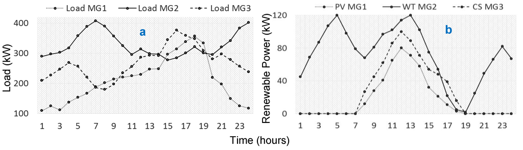 The forecasted hourly load profile of each MG is shown is Figure 4a, while Figure 4b shows the hourly output powers of non-dispatchable generators. The parameters related to BESSs, CGs and RGs are listed in Table 1.