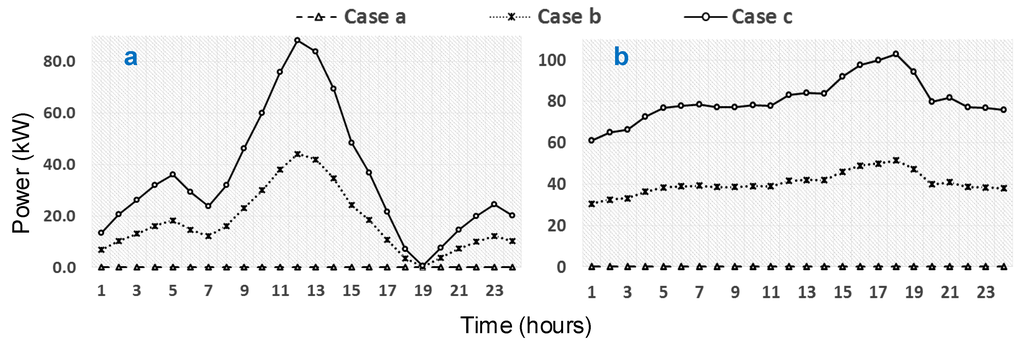 In this section, the multi-microgrid scheduling problem has been solved by considering uncertainty in electric loads only. The hour-wise uncertainty gap is shown in Figure 5b. In this section also, three cases have been considered. Case a is the deterministic case (load with nominal values), Case c is the worst-case (load increased by 10%) and Case b is an intermediate case (load increased by 5%). The trend of uncertainty gap is different from that of Section 5.2 where, due to uncertainty in renewable energy sources, maximum uncertainty can be observed at the noon time. However, due to the presence of load in all the time intervals the uncertainty is comparatively uniform and can be observed from Figure 5b.