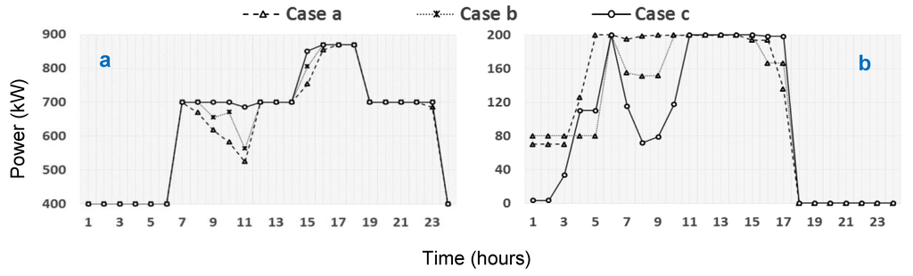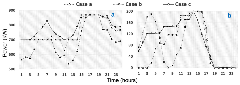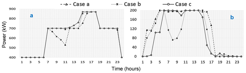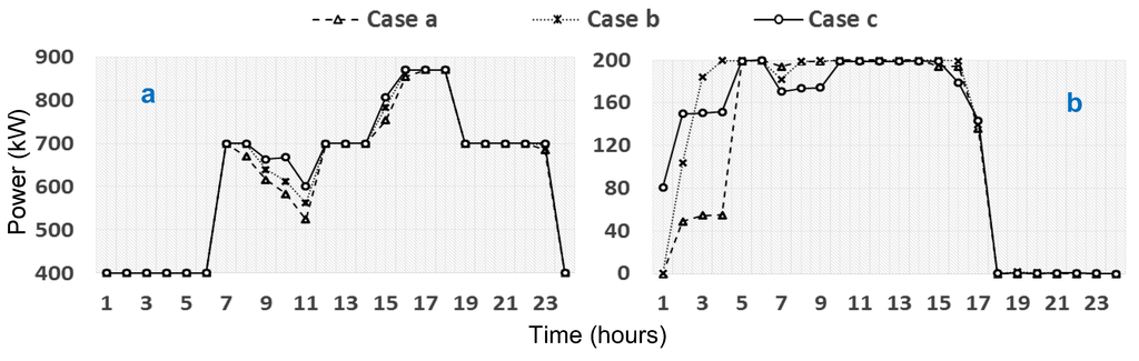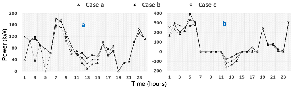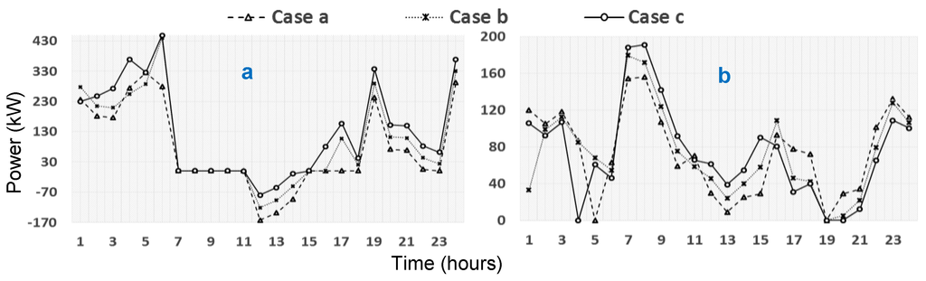 Case c: The uncertainty gap of Case c is wider than that of Case b as shown in Figure 5a. Therefore, Case c realization requires more generation or internal/external trading to assure the feasibility of solution even in the worst-case scenario. However, Figure 7 and Figure 8 depict that the general behavior of Case c is similar to that of Case b. The driving force of this behavior is the minimization of the operation cost which can be achieved by buying from utility grid and charging BESSs in off-peak price intervals, increasing generation of CGs in the mid-peak price intervals, and increasing the selling to the utility grid and discharging BESS in the peak price intervals.