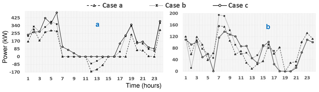 Case b: It can be observed from Figure 7b that in time intervals 1–4, 6, and 24, uncertainty gap has been filled by buying more power from the utility grid. Figure 8a shows that CG generation has been increased in the time intervals 8–11, 15, 16, and 23 to fulfill the gap. Figure 7a shows that amount of selling power has been reduce in time intervals 12–14 to suffice the energy needs of microgrids. Figure 8b shows that BESSs have been charged in the initial off-peak price intervals and discharged in the peak intervals of price. Figure 7a shows that internal trading is increased when CG generation is increased or BESS is discharged. Such type of behavior can be observed in time intervals 8–11, 16, 16, 23 and 15–18, respectively.
