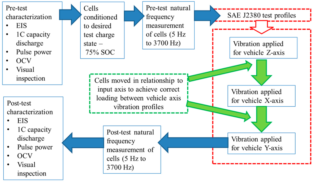 The SAE J2380 vibration test comprises of vertical (Z-axis) profiles in addition to vibration profiles defined for the horizontal plane (X-axis and Y-axis). As part of the experimental procedure, the SAE J2380 profiles are sequentially applied to the cells to achieve the desired 100,000 miles of representative North American customer usage. For a complete execution of SAE J2380 standard the three different combinations of vibration loads with respect to cell orientation are defined below [4]: