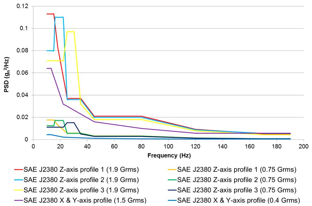 SAE J2380 is applied within the frequency range of 10–190 Hz. Vibration is applied to vertical (Z) axis of the device under test (DUT) via three different PSD’s, each of which are applied at two different Grms levels and different durations. As a result; six separate load cases are performed to achieve a single evaluation of the Z axis. The longitudinal axis (X and Y axis) of the DUT are evaluated by a single spectra which like the vertical axis spectra, is conducted at two different Grms levels and durations. A full evaluation of all three axis of a RESS or sub component takes 92 h and 32 min (16 h and 12 min for Z axis profiles and 38 h and 10 min for both the X and Y axis each). Further information on the SAE J2380 profiles are defined in [27,32] It must be noted that SAE J2380 is the same as the random vibration “procedure 10” defined within [32]. The SAE J2380 random vibration profiles are presented in Figure 2.
