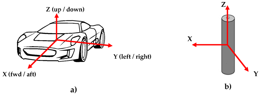 (a) Axis convention of vehicle vibration durability profiles; (b) Axis convention of cells [4].