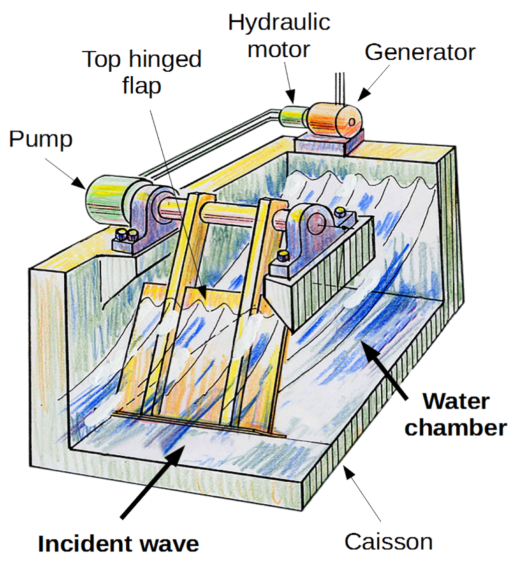 To date, no particular distinct method exists for harnessing wave energy, although several types of devices have been developed using a gamut of approaches. The Pendulor device, among the class of terminators is one of the pioneers in this field. This device works in a manner quite opposite to that of the top-hinged flap type wave maker (Figure 1). Although the Muroran Institute of Technology (Japan) produced the Pendulor device as a result of the work done in the early 1980s [1], several efforts continue to be made to improve it [2]. A good percentage of these studies were focused mainly only on experimental verification, and most reports recorded that a conversion efficiency of 40%–60% was possible by the systems for sea conditions prevailing in the Muroran bay at peak wave considitons [3,4,5]. The experimental laboratory results of these Pendulor devices indicated that the primary energy conversion efficiency can reach up to 82% for regular waves [6]. Following this, several trials have been conducted at sea using these Pendulor type devices in Japan, at two places in Hokkaido [7]. All the studies reported good device performance for conversion efficiency. More recent studies have paid greater attention to improve the secondary power transmission unit, like the rotary vane pump [5]. In Japan and Korea recent research work studied a floating version of the device as an offshore version, in which the caisson is integrated into a stabilised floater [8]. Another device closely resembling the Pendulor is the early version of Oscillating Surge Wave Converter (OSWC). That is different from Pendulor in concept, as it uses an oscillating water column rather than a straight chamber on the lee side [9]. With respect to the original concept of the Pendulor, the flap fucntions at the node point of the standing waves produced in a straight caisson where the maximum wave surging effect is felt. Thus, the caisson significantly affects the the device performance. Several studies are currently being conducted to identify superior caisson configurations to enhance the device performance and optimise the caisson size at the same time [10].