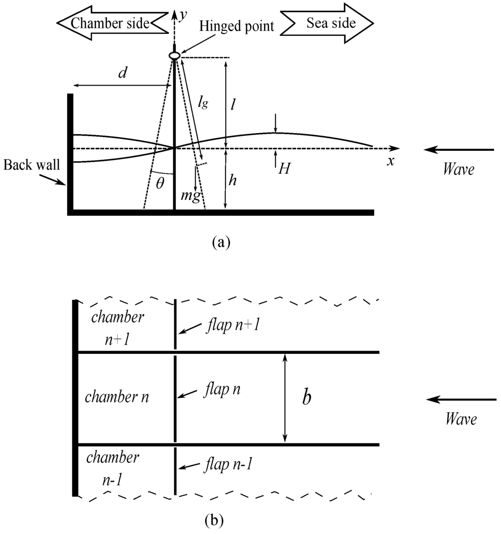 When chamber side velocity potential should take the form of that of the sea side. That can be proved by using exponential functions. Here is a parameter which depends on the boundary conditions. Equation (A14) shows the x coordinate of the bottom hinged flap with respect to the vertical distance y.