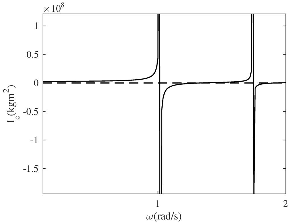 In the chamber side, the added inertia and hydrostatic restoring moments alone constituted the hydrodynamic moments on the flap (refer appendix A). Damping was absent in the chamber side. All the energy contributed by the flap to the water mass returns once again back to the flap via the hydrostatic restoring action. The chamber side added inertia and hydrostatic restoring moment are expressed in Equations (20) and (21), respectively (see the same equations in the Appendix A as Equation (A27) and Equation (A26)). Figure 4 reveals the variation of the added inertia with frequency for the range 0 to 2 rad/s. The added inertia function reveals its asymptotic nature at the points ( is related to ω by dispersion relationship), where the anti-nodes of the standing waves in the chamber coincide with the flap. It is significant that the large negative or positive added inertias are found at those frequencies due to the production of great positive or negative pressures at the flap surface. These great negative pressures can induce a possible flow separation between the flap and water mass that generally affects the bodies with the surface piercing effect. Whereas, the hydrostatic restoring coefficient (given in Equation (21)) is dependent solely on the chamber geometry (refer to the Appendix A).