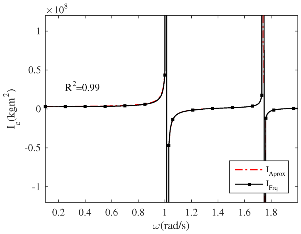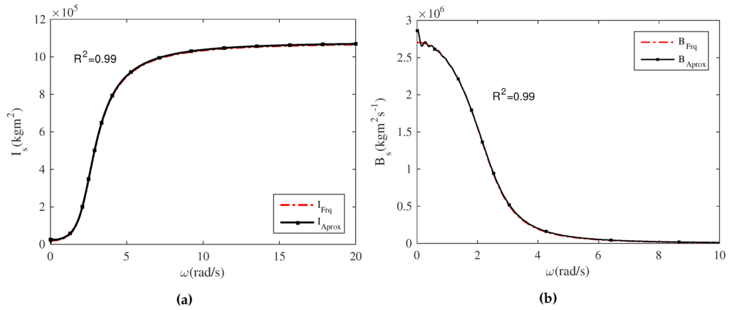 For the chamber side, trials conducted using the TDI methods produced poor matching results mostly because of the errors in the frequency response function caused by singularities in the added inertia function (as seen in Figure 4). A good alternative was the “tfest” command in Matlab [30] which was successful in approximating the TF directly without converting to the time domain. Therefore, the radiation moment function simply takes on the form of Equation (18) without modifying it with the limiting value of the term added inertia . In such cases, the frequency domain data were drawn from the area of interest in which a majority of the ocean waves were concentrated (0.1 to 2 rad/s). In Figure 7 the frequency domain data given by the approximated TF and frequency domain data of the potential functions for the added inertia were compared. Both are well fitted with accuracy.