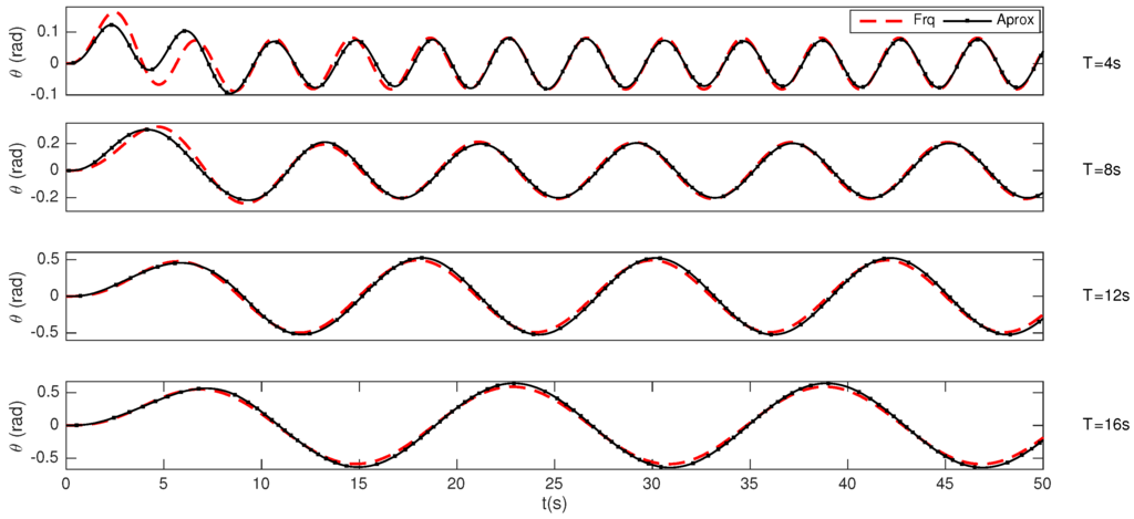 To verify the validity of the approximations, the time domain solutions of Equation (4) are compared with the corresponding solutions in Equation (25). Figure 8 lists the results of the amplitude of oscillations for different frequencies at no load condition () for 50 s duration. The dotted lines indicate the time domain results of Equation (4) whereas the solid lines imply the corresponding time domain solution of Equation (25). Both solutions are well fitted for the wider frequency range and thus the validity of the approximated time domain model is confirmed for further calculations.