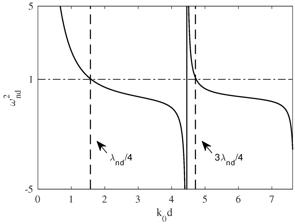 The device dynamics can be obtained for linear damping in the frequency domain employing Equation (26). In order to utilise maximum power, it must fulfil the resonance condition , and impedance matching condition where is the resonance frequency. A dimensionless frequency is introduced as where . The total added inertia, radiation damping and hydrostatic restoring coefficient can be identified as and respectively. is ignored through the entire calculations assuming that the PTO system does not exist a restoring effect. The dimensionless frequency is plotted with the dimensionless chamber length as seen in Figure 9 in which the dimensionless chamber length is , dimensionless wave length is and λ is the incident wave length. Then indicates the flap resonance frequency, and it happens when attains the value , where the nodes of the standing wave are noted with reference to the back wall. Therefore, the placement of the flap at a node is crucial for the device performance (frequency matching) and the first node point is observed at one-quarter of the wave length from the back wall. For the device model in this study, the corresponding chamber length becomes to 18 m at the 12 s design wave period.