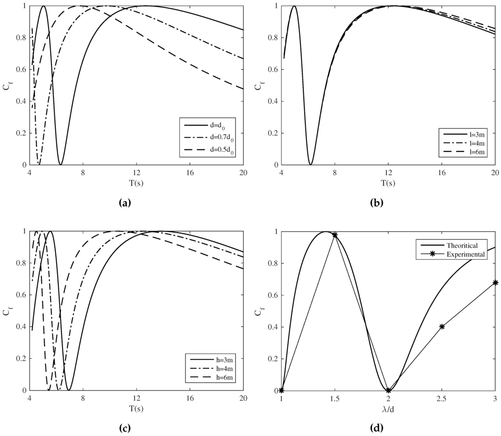Variation of capture factor (Cf) with wave period (T), for variable (a) d, (b) l, (c) h, and (d) experimental [31] and theoretical comparison of Cf with normalized wave length (λ/d).
