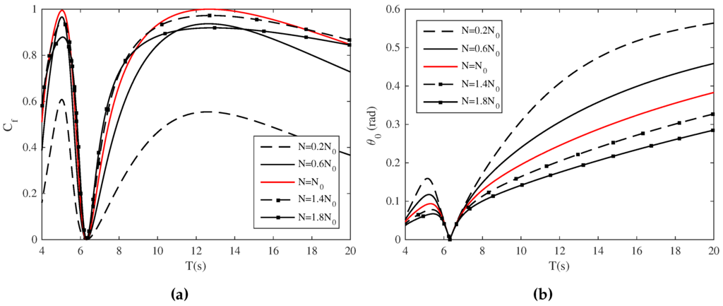 (a) Variation of capture factor (Cf) and (b) Amplitude of angle of oscillations (θ0), with wave period (T), for different PTO system damping (N).