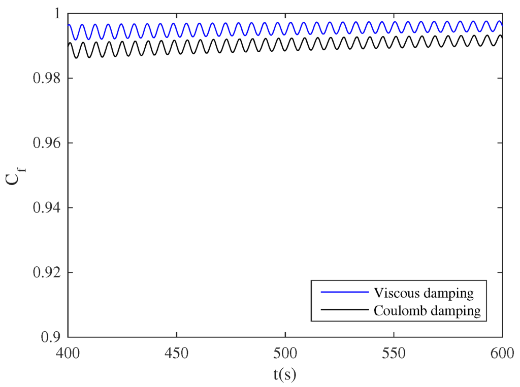 variation between the linear (viscous) and coulomb damping models (blue line: for linear (viscous) damping; black line: for Coulomb damping).