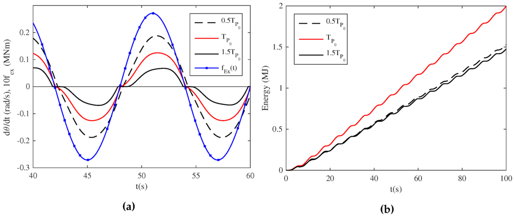 In order to assess the optimum frictional torque , an equivalent frictional toque was attained by equating the half-cycle energy dissipation of the linear damper at the optimal tuned condition [32] as seen in Equation (28). Here the reference value of was taken for the regular 12 s wave period and the 1.35 m wave height (in this case, Nm assessed by employing Equation (28)).